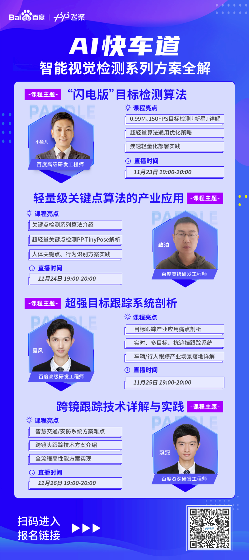 11月23日-26日 19:00-20:00,百度资深高工将深入解读通用目标检测的基础理论与实践、超轻人体关键点模型的理论及应用,并全方位解析实时跟踪系统,对各类痛难点提供最优解决方案,更有直播现场答疑解惑,还在等什么!抓紧扫码上车吧!
