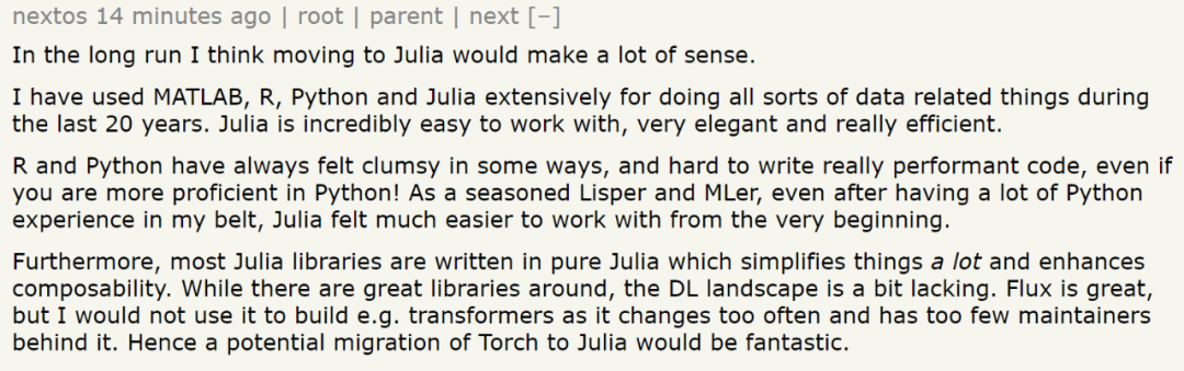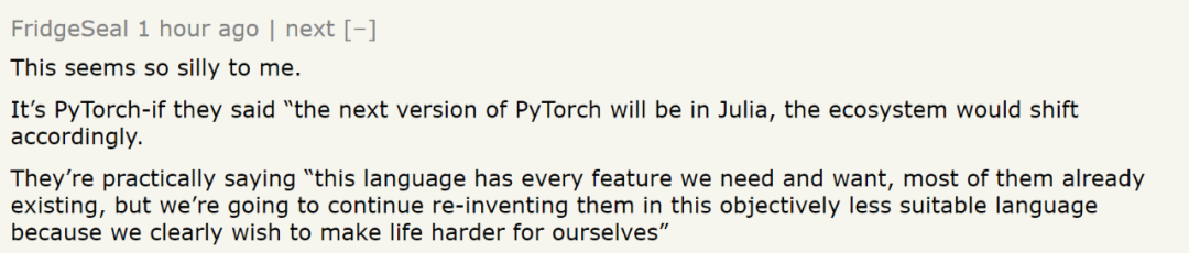 从这份回答我们可以看出,PyTorch 逐渐靠近 Julia 已成定势,但鉴于 Python 在生态系统方面的绝对优势,下一代 PyTorch 不太可能直接用 Julia 编写。对于这一做法,有人表示非常不理解。ta 认为,以 PyTorch 的生态号召力,如果下一版他们直接宣布用 Julia,那么生态问题很快就会迎刃而解。