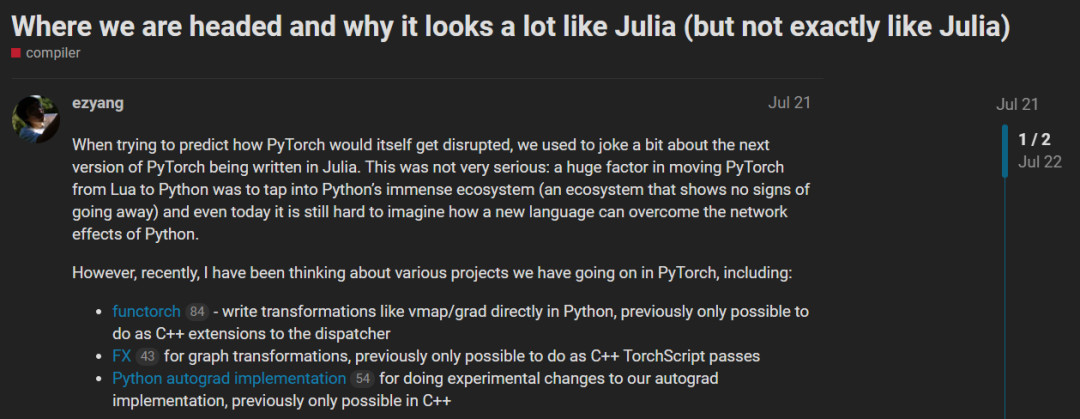 如果你也是一位 PyTorch 用户,你会赞成哪种做法?欢迎在评论区留言讨论。https://dev-discuss.pytorch.org/t/where-we-are-headed-and-why-it-looks-a-lot-like-julia-but-not-exactly-like-julia/276https://news.ycombinator.com/item?id=29354474