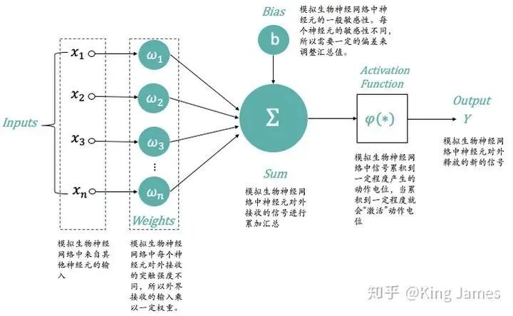 - ω_1,ω_2,ω_3,ω_n:模拟生物神经网络中每个神经元对外接收的突触强度不同,所以外界接收的输入乘以一定权重;