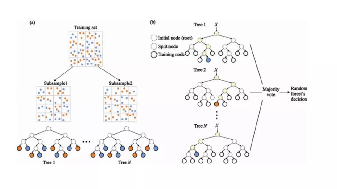 (a)在训练过程中,每个决策树都是基于训练集的引导样本来构建的。