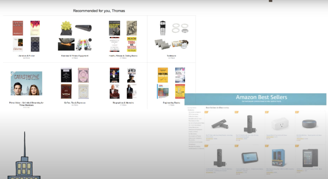 这里可以看到一个案例——亚马逊建立的推荐系统,当中将用用户经常购买的产品排列在一起,并根据产品的性能进行排名。