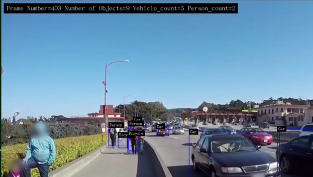 注意粗体“osd_sink_pad_buffer_probe”部分,这是代码中另一个重点,需要自行撰写代码去执行的部分,就是代码中第41~126行的内容,这里面的处理以“帧”为单位(在“while l_frame is not None:”里面),将该帧所检测到的物件种类进行加总,并且将物件根据种类的颜色画出框框。