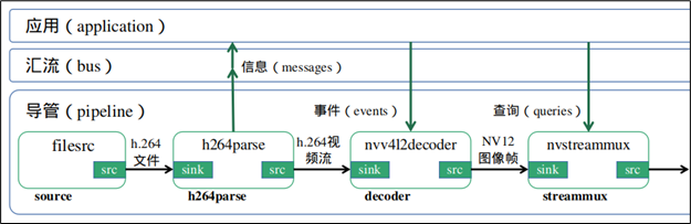 pipeline = Gst.Pipeline() 用 Gst.ElementFactory.make() 创建所需要的元素,每个元素内指定插件类别(粗体部分)并给定名称(自行设定):source = Gst.ElementFactory.make("filesrc", "file-source")h264parser = Gst.ElementFactory.make("h264parse", "h264-parser")# 调用NVIDIA的nvdec_h264硬件解码器decoder = Gst.ElementFactory.make("nvv4l2decoder", "nvv4l2-decoder")# 创建nvstreammux实例,将单个或多个源数据,复用成一个“批(batch)”streammux = Gst.ElementFactory.make("nvstreammux", "Stream-muxer")# 使用NVINFERE对解码器的输出执行推理,推理行为是通过配置文件设置pgie = Gst.ElementFactory.make("nvinfer", "primary-inference")# 根据nvosd的要求,使用转换器将NV12转换为RGBA