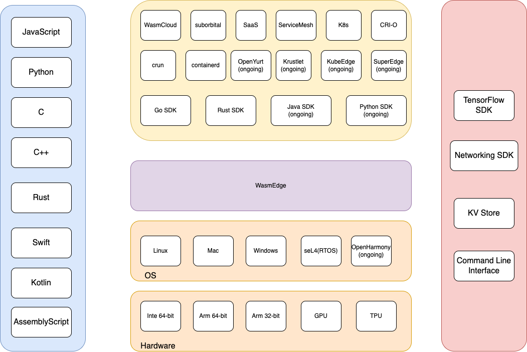 如今业界已经围绕 WebAssembly 构建起了一个非常庞大的生态,Runtime 可以说是整个生态中最底层的基础设施(下图是以 WasmEdge 为例描绘的 WebAssembly 生态图)。其中最有代表性的项目包括 WasmEdge、V8、Wasmtime、WAMR 等,不同 Runtime 各有各的应用场景和优化点。