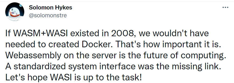 而说到 WebAssembly 最初与 Docker、云原生产生关联,就不得不提 Docker 联合创始人 Solomon Hykes 在 2019 年 3 月份发布的一条推文。他在推文中表示:如果 WASM(WebAssembly)和 WASI(WebAssembly System Interface, WASM 系统接口)在 2008 年就已经存在,那就没有必要创建 Docker 了。