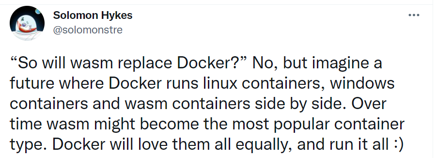 这条推文在社区里引起了很大的反响,有赞同者,但更多的是质疑:WebAssembly 这个发源于浏览器的东西,怎么突然就能在服务端取代 Docker 了呢?随后 Solomon 又发布了一条推文解释道:WebAssembly 不会取代 Docker,但是可以想象未来 WebAssembly 应用容器将与 Linux 容器、Windows 容器在 Docker 中并列运行。如今,Solomon 说的未来已经成为现实,只不过他原话中的 Docker 替换成 Kubernetes 更准确。