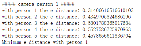 # 对于某张人脸,遍历所有存储的人脸特征 # for every faces detected, compare the faces in the database e_distance_list = [] for i in range(len(features_known_arr)): # 如果 person_X 数据不为空 if str(features_known_arr[i][0]) != '0.0': print("with person", str(i + 1), "the e distance: ", end='') e_distance_tmp = return_euclidean_distance(features_cap_arr[k], features_known_arr[i]) print(e_distance_tmp) e_distance_list.append(e_distance_tmp) else: # 空数据 person_X e_distance_list.append(999999999) # 找出最接近的一个人脸数据是第几个 # Find the one with minimum e distance similar_person_num = e_distance_list.index(min(e_distance_list)) print("Minimum e distance with person", int(similar_person_num)+1)