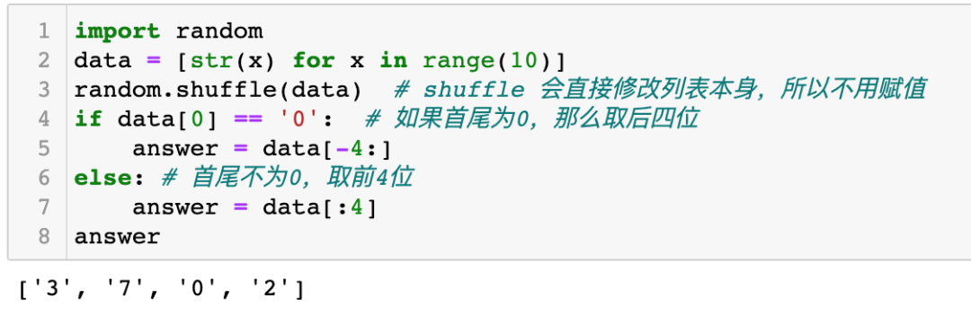 import random data = [str(x) for x in range(10)] random.shuffle(data) # shuffle 会直接修改列表本身,所以不用赋值 if data[0] == '0': # 如果首尾为0,那么取后四位 answer = data[-4:] else: # 首尾不为0,取前4位 answer = data[:4]