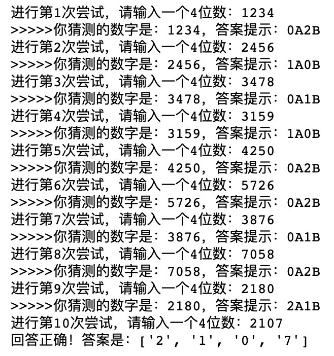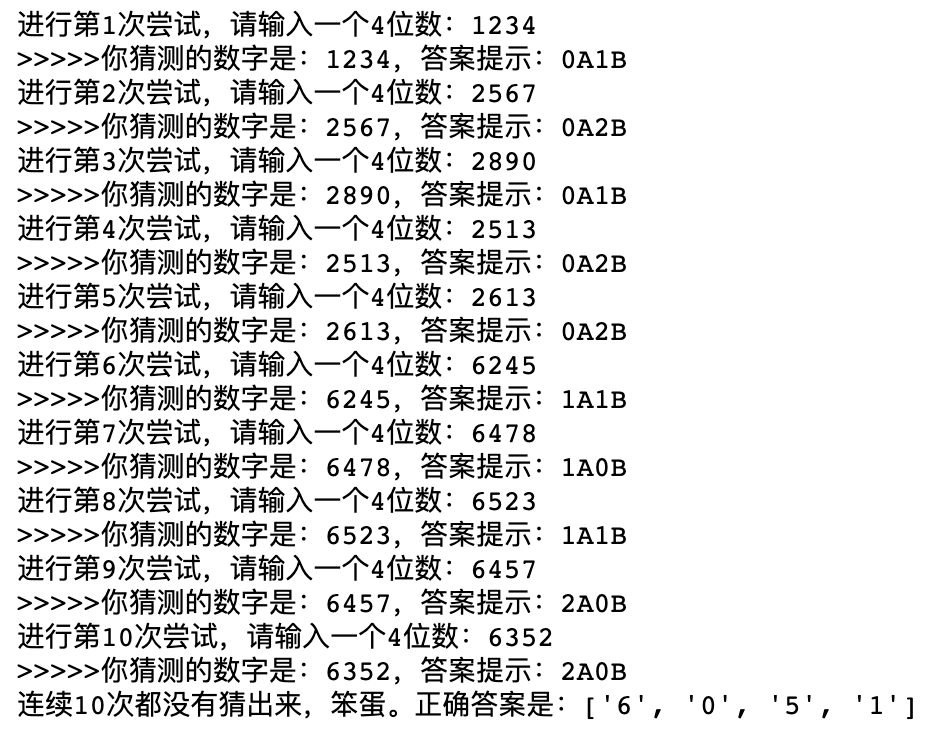 接下来,让玩家连续进行10次尝试,每次输入一个4位数: