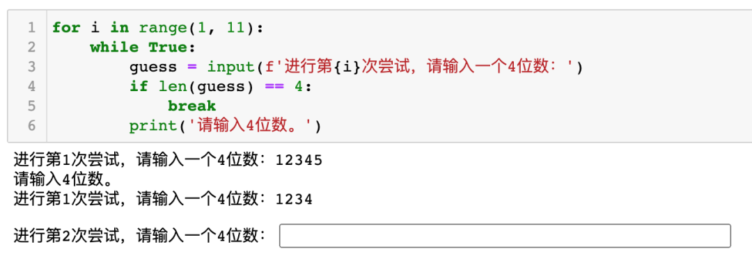 for i in range(1, 11): whileTrue: guess = input(f'进行第{i}次尝试,请输入一个4位数:') if len(guess) == 4: break print('请输入4位数。')