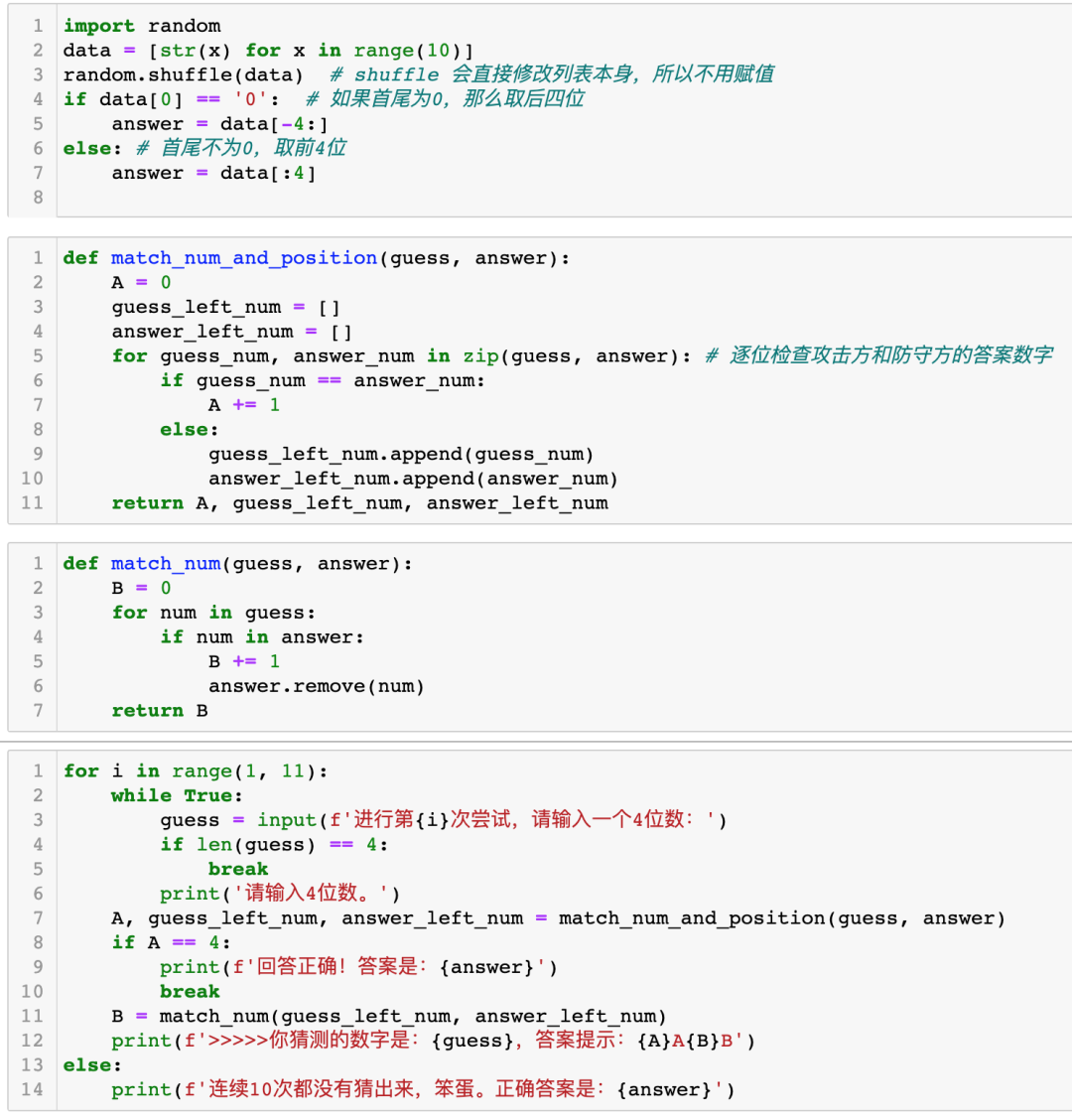 defmatch_num_and_position(guess, answer): A = 0 for guess_num, answer_num in zip(guess, answer): # 逐位检查攻击方和防守方的答案数字 if guess_num == answer_num: A += 1 else: guess_left_num.append(guess_num) answer_left_num.append(answer_num) return guess_left_num, answer_left_num