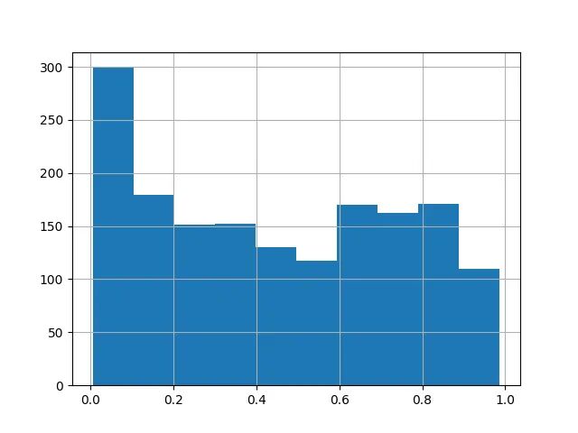 可见,预测为 0 的数量具有较高的峰值,这表示存在一个数据子集,模型非常确定它的标签是 0,除此之外,分布看起来比较均匀。