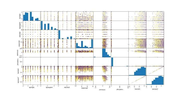 图由作者提供。数据集中所有特征的配对图,以目标为颜色。黄色块代表 False,紫色块表示 True。