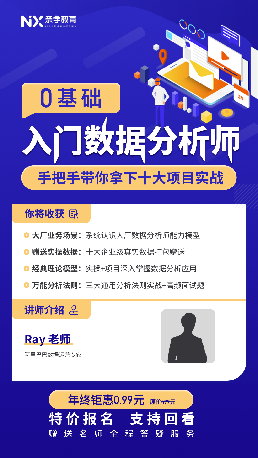 这里分享一下 Ray 老师在奈学教育最新推出的《零基础商业数据分析速成训练营》,分享多年数据分析工作经验和商业实战经历,帮助小白从0到1入门数据分析,深度剖析当下互联网企业的数据分析痛点需求,系统掌握这项重要且值钱的技能,带你掌握高薪数据分析师必备的岗位技能!