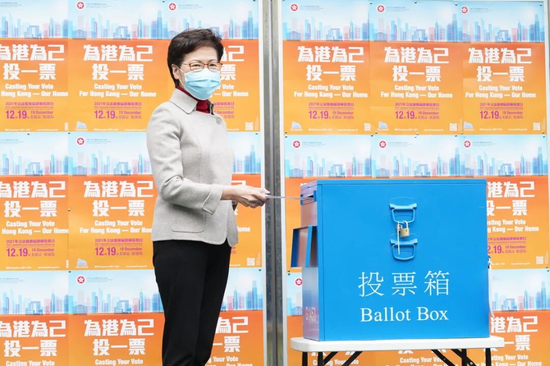 ▲ Carrie Lam Cheng Yuet-ngor, HKSAR's chief executive, casts her ballot at a polling station on Sunday morning. Photo/Xinhua