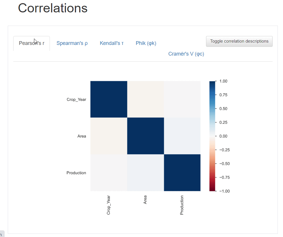 3. 相关性 相关性用于描述两个变量相互协调移动的程度。在熊猫分析报告中,可以访问 5 种类型的相关系数:Pearson's r、Spearman's ρ、Kendall's τ、Phik (φk) 和 Cramér's V (φc)。