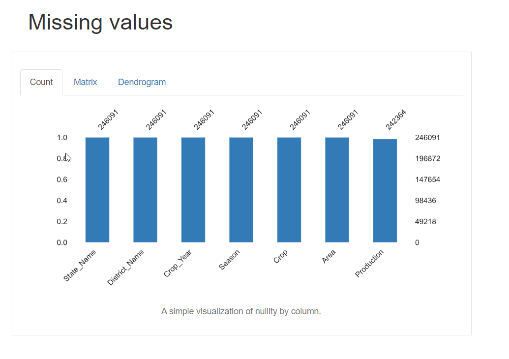 4. 缺失值 生成的报告还包含数据集中缺失值的可视化。您将获得 3 种类型的图:计数、矩阵和树状图。计数图是一个基本的条形图,以 x 轴作为列名,条形的长度代表存在的值的数量(没有空值)。类似的还有矩阵和树状图。