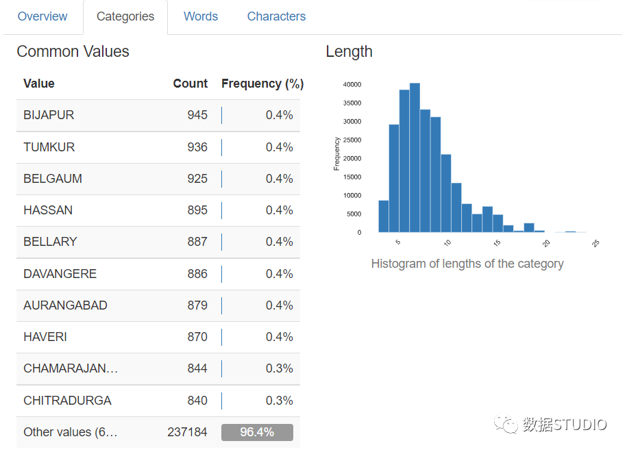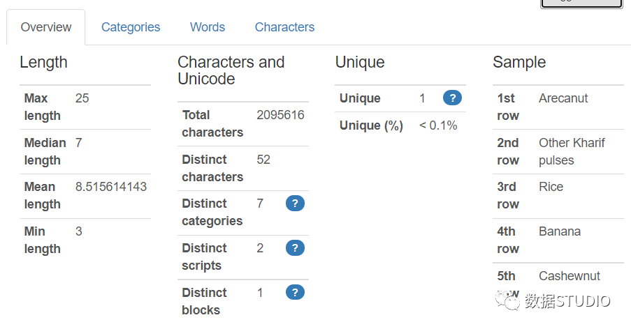 字符串类型值的概览选项卡显示最大-最小中值平均长度、总字符、不同字符、不同类别、唯一和来自数据集的样本。