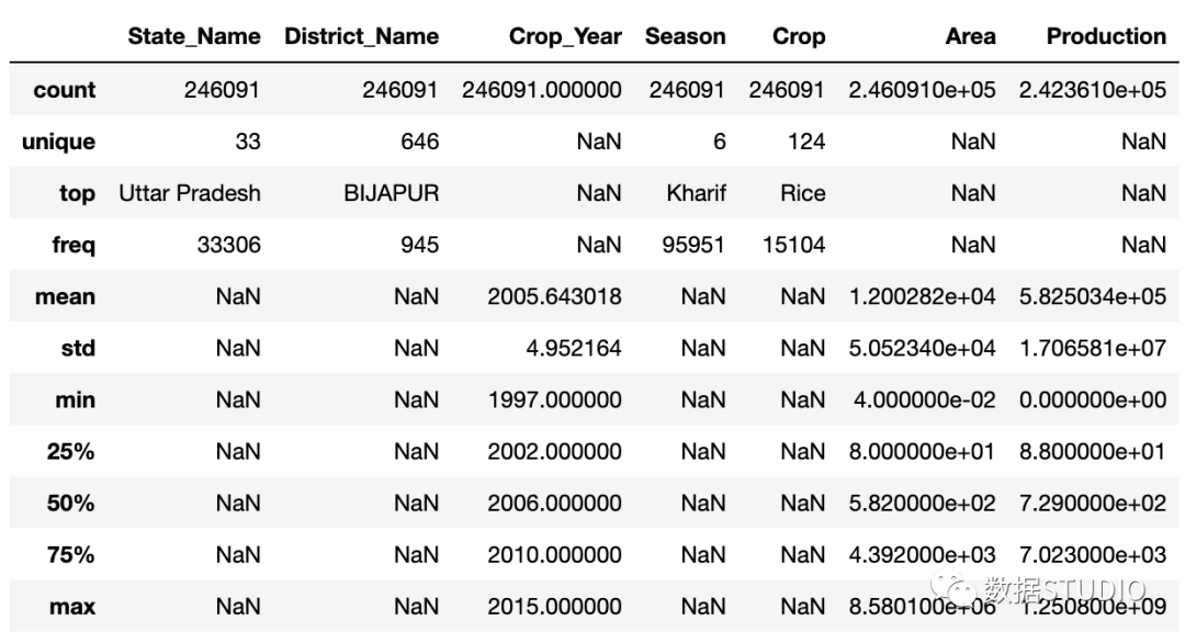 import pandas as pd df = pd.read_csv("crop_production.csv" )在我讨论 pandas_profiling 之前,先看看数据帧的 Pandas describe 函数输出: