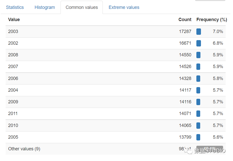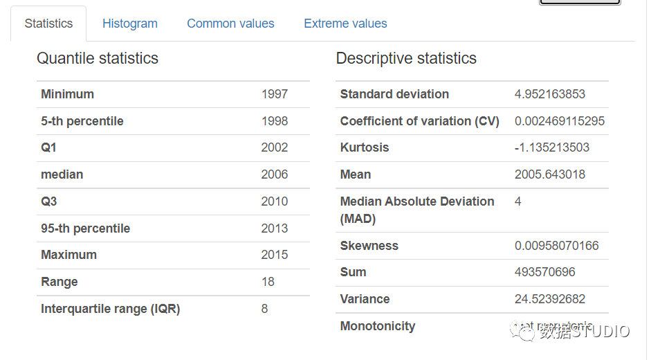 切换按钮来展开的Statistics, Histogram, Common values, Extreme values 选项卡。