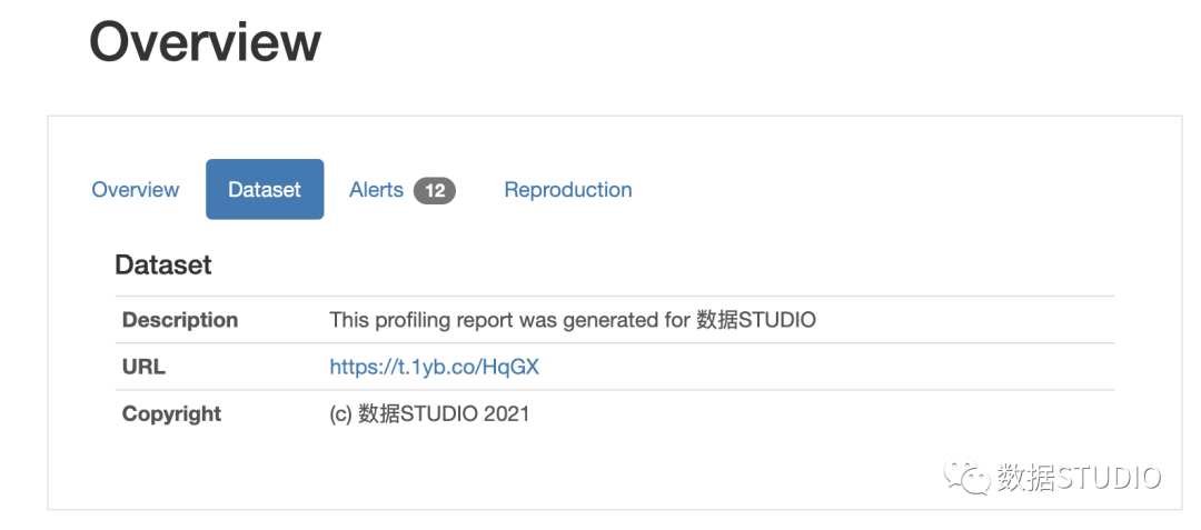 添加元数据 您可以添加 “title”, “description”, “creator”, “author”, “URL”, “copyright_year”, and “copyright_holder” 等信息。此信息将出现在数据集概述部分。对于此元数据,将创建一个名为“dataset”的新选项卡。要将此数据添加到报告中,请在 ProfileReport 函数中使用 dataset 参数并将此数据作为字典传递: