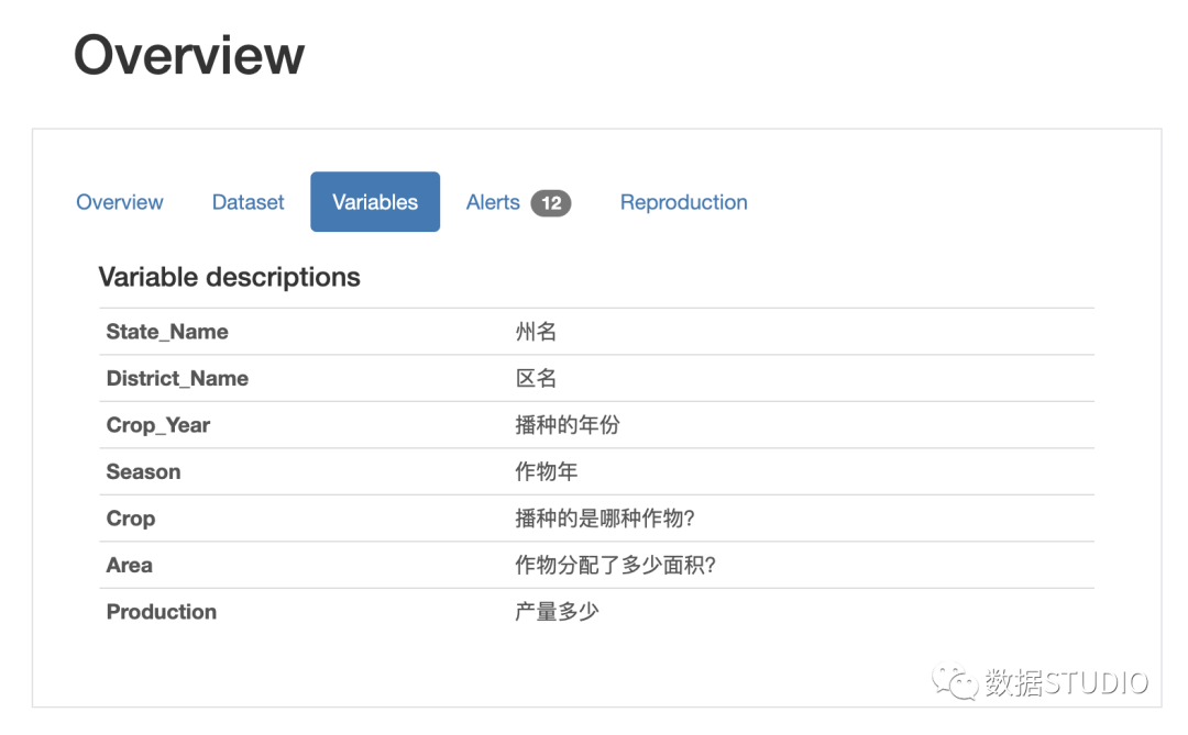 "descriptions" : {"State_Name" : "州名" ,"District_Name" : "区名" ,"Crop_Year" : "播种的年份" ,"Season" : "作物年" ,"Crop" : "播种的是哪种作物?" ,"Area" : "作物分配了多少面积?" ,"Production" : "产量多少" , } }当您将其添加到 ProfileReport 函数时,将在概览部分下创建一个名为“variables”的单独选项卡: