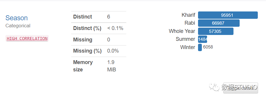 conda env create -n pandas-profiling conda activate pandas-profiling conda install -c conda-forge pandas-profiling 数据集和设置 看下如何启动 pandas_profiling 库并从数据框中生成报告了。首先导入一个将为其生成报告的数据集。该数据集包含 State_name、District_name、Crop_year、Season、Crop、Area 和 Production的农业数据集 。数据集获取方式可以在公众号『数据STUDIO』 消 息后台回复【PF】获取!
