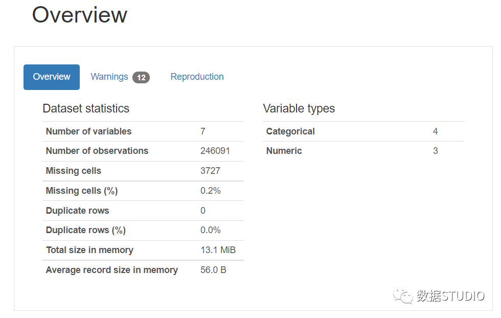 该Overview 包括总体统计的。这包括变量数(数据框的特征或列)、观察数(数据框的行)、缺失单元格、缺失单元格百分比、重复行、重复行百分比和内存中的总大小。