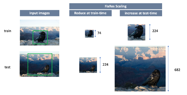 FixRes 技术采用非此即彼的方法。它要么降低训练时间分辨率并保持测试裁剪的大小,要么增加测试时间分辨率并保持训练裁剪的大小。目的是检索相同大小的对象(此处是乌鸦),以减少 CNN 中的尺度不变性 [2] 。如下所示: