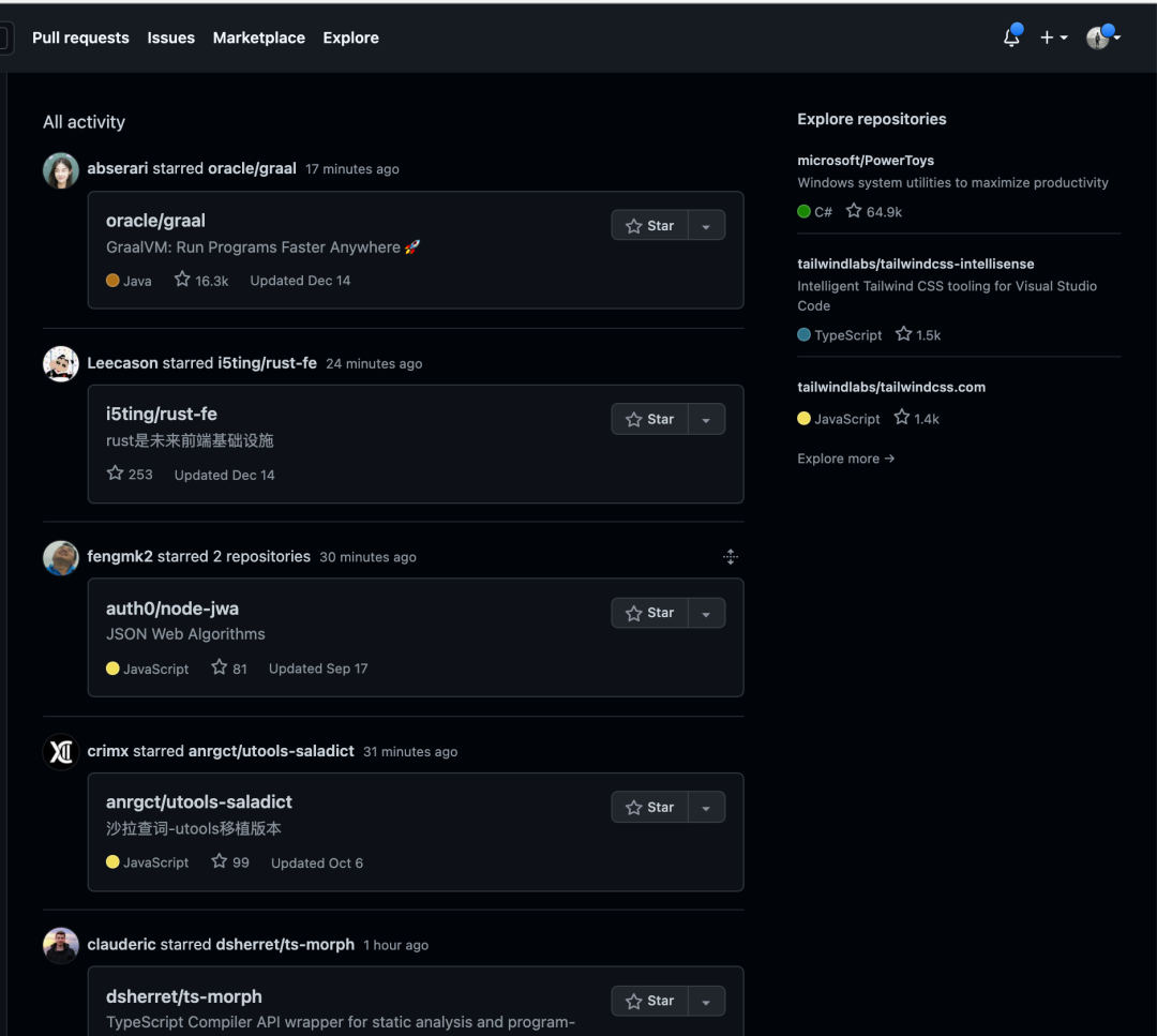 当你关注他们之后,之后你已进入 Github 就可以在你自己的关注 Feed 流里面了解到这些人最近的动态,比如 Star 了哪些项目?Follow 了那些人?发布了那些包更新?久而久之,当你关注的人越来越多,你的个人关注 Feed 流就成为了你每天获取新技术信息的来源,站在这些 “巨人” 的肩膀上,获取高效的信息!