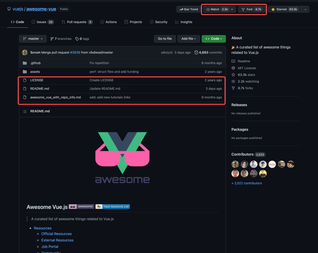 当然如果短时间内你并没有找到你合适的想法去提交自己的 Github,那么你可以去尝试模仿大多数的 “一个文件” 的贡献,即整理一个 README.md,将自己平时看 Github Trending 时觉得好的内容记录下来,系统的分类并整理成一个榜单,随着你的坚持,你可能能达到如下效果:https://github.com/vuejs/awesome-vue