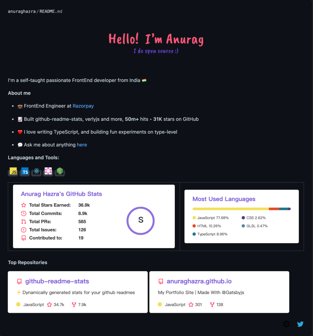 你会发现 Github 已经可以写好看的自我介绍了:https://github.com/anuraghazra/github-readme-stats