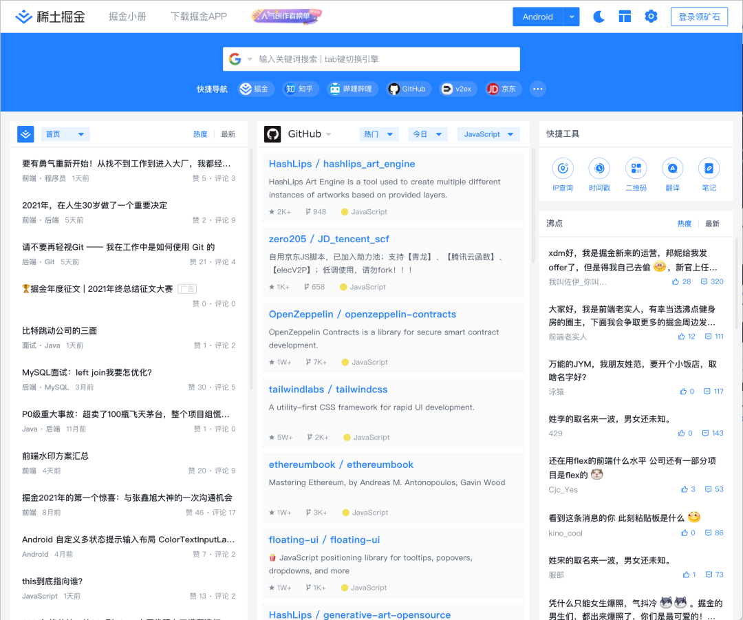 你可以看到掘金文章、Github Trending 的内容,还有掘金沸点,极其适合上班摸鱼。