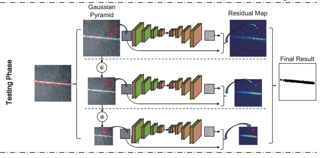 主要思想:织物疵点检测是纺织制造业质量控制中必不可少的环节。传统的织物检测通常采用人工视觉的方法进行,效率低,长期工业应用精度差。论文提出使用高斯金字塔结合语义分割的方式来重建缺陷,推理阶段通过结合多尺度结果,完成融合。这种方法在织物疵点检测中有几个突出的优点。首先,只需少量的无缺陷样本就可以进行训练。这对于收集大量有缺陷样品困难且不可行的情况尤其重要。其次,由于采用了多模态积分策略,与一般的检测方法相比,该方法具有更高的鲁棒性和准确性。第三,根据我们的结果,它可以处理多种类型的纺织面料,从简单到复杂。实验结果表明,该模型具有较强的鲁棒性和良好的整体性能。4、An Unsupervised-Learning-Based Approach for Automated Defect Inspection on Textured Surfaces