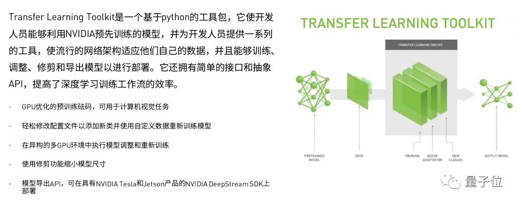 NVIDIA迁移式学习工具包(Transfer Learning Toolkit,简称TLT)是一个基于Python的工具包,它提供了大量预先训练的模型,并提供一系列的工具,使流行的网络架构适应开发者自己的数据,并且能够训练、调整、修剪和导出模型,以进行部署。