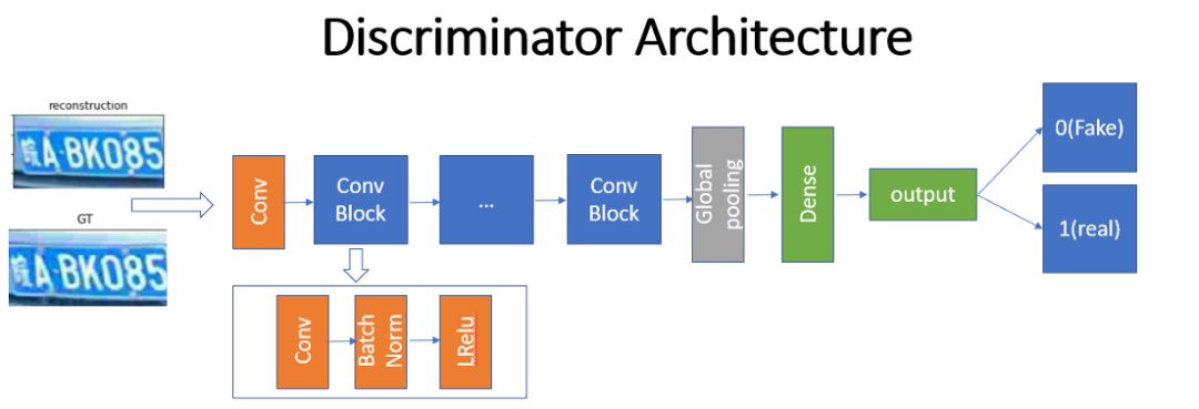 我们在本项目中使用的数据集为中国城市停车场数据集(https://github.com/detectRecog/CCPD) ,它包含了200k+个不同条件下的汽车图像,然而原始数据不能被直接使用,但是我们只需要车牌图像而不是街景和汽车,因此第一步是使用数据集提供的注释从图像中裁剪出车牌图像。我们还过滤掉亮度和对比度差的图像,只保留好的部分作为标签。我们人工生成车牌图像数据(input,label),其中输入经过降采样和噪声、同时随机进行亮度和对比度的破坏,而标签不变。我们的模型受ESRGAN模型(https://arxiv.org/abs/1809.00219) 的启发。顾名思义,我们的模型是在对抗性的方式下进行训练的——生成器和鉴别器相互对抗。