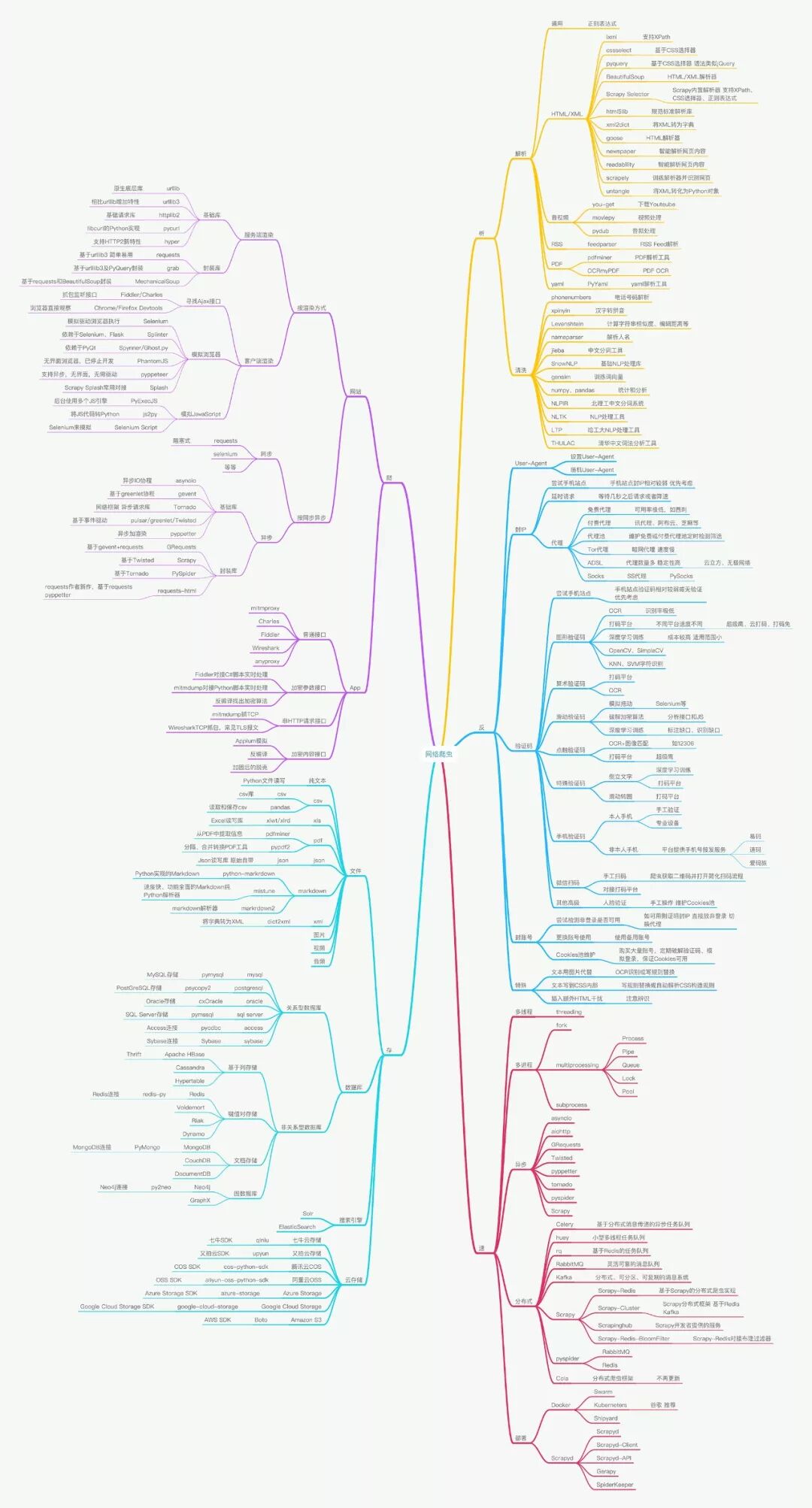 然后讨论了 urllib、requests 等请求库和 Beautiful Soup、XPath、pyquery 等解析库以及文本和各类数据库的存储方法