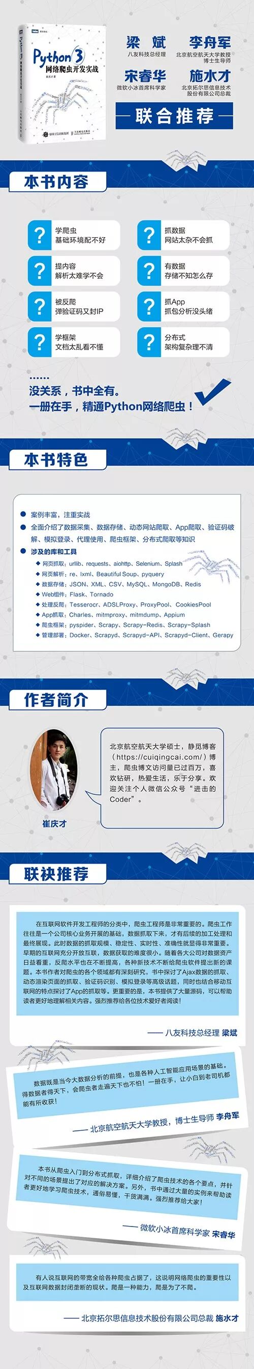 小崔老师从 2015 年开始接触爬虫,并将自己的学习总结分享在博客上,目前,博客访问量过百万。新书一上架即成为各大网店新书畅销榜榜首图书。此外,这本书也得到了多位技术大咖的推荐。
