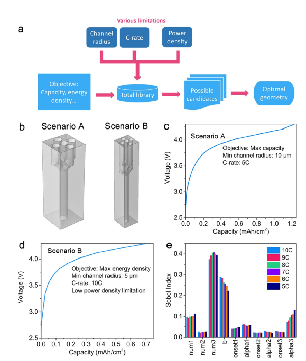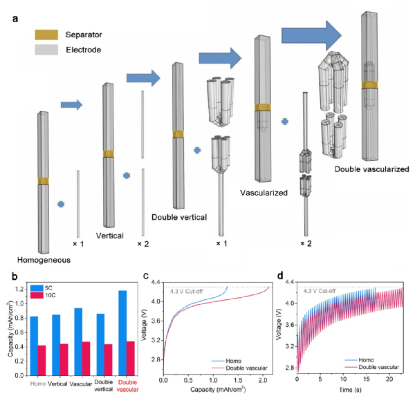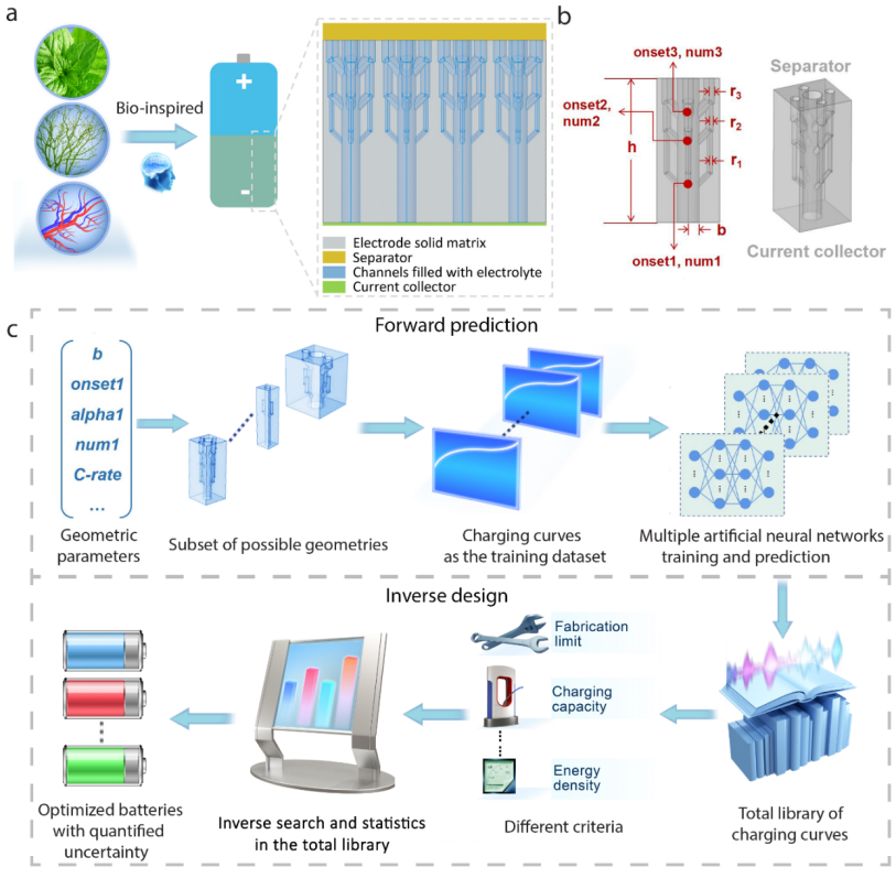 大自然已经提供了大量示例来解决这种多变量运输优化问题。数十亿年的进化在生物体中创造了复杂的运输系统,例如植物根、叶脉和血管,其中血管化通道进化以找到质量运输、代谢效率和均匀性之间的最佳平衡。受大自然的启发,许多研究人员设计并制造了脉管系统,用于在气体传感器、微流体系统和燃料电池等应用中进行高效运输。因此,我们假设这种脉管系统方法也可以应用于锂离子电池,以在不牺牲材料利用率或容量的情况下实现快速充电。尽管具有超越传统方法的巨大潜力,但锂离子电池的血管结构优化尚未得到很好的研究,这可能是由于巨大的参数空间。