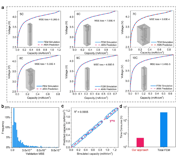 。(c) 模拟数据和人工神经网络预测数据之间的相关性。所有数据点都在 y = x 附近对齐,代表训练的神经网络的高精度。(d) 使用我们的深度学习预测与传统有限元计算来构建总库的计算时间。