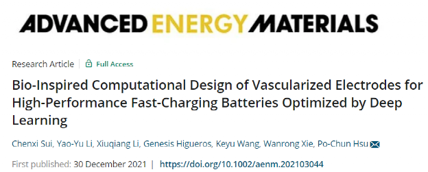 Chenxi Sui, et al. Bio-Inspired Computational Design of Vascularized Electrodes for High-Performance Fast-Charging Batteries Optimized by Deep Learning. 2021, AEM.