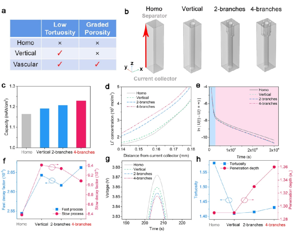 图 2. 不同电极结构的电化学对比分析。(a) 表格比较了同质(传统)电极、垂直通道电极和我们的血管通道电极。确定了两个关键因素:曲折度和梯度孔隙度。(b) 此计算中的unit cell。血管通道位于活性材料-分离器界面附近。红色切割线是unit cell的边缘,用于锂离子插入浓度计算。(c) 各种电极结构在 5C 下的充电容量。(d) 在 10C 下 x 轴范围从 0.14 到 0.18 mm 的锂离子嵌入浓度分布的放大图。切割线在图 2b 中定义。(e) 直流去极化测试。存在两种线性扩散过程:蓝色阴影中的快速动力学过程:1000 ~ 2000 s 和红色阴影中的慢动力学过程:2000 ~ 30000 s)。(f) 快速(1000 ~ 2000 s)和慢速(2000 ~ 30000 s)扩散过程的不同电极几何形状的拟合斜率,代表电压衰减因子。(g) 一个脉冲过程的放大高充电倍率脉冲充电图。(h) 使用活性材料-隔膜界面附近不同几何形状的物理模型计算的曲折度和穿透深度。