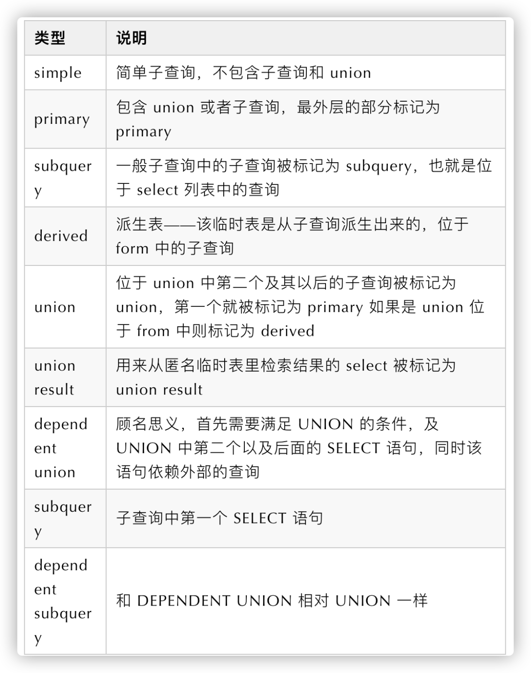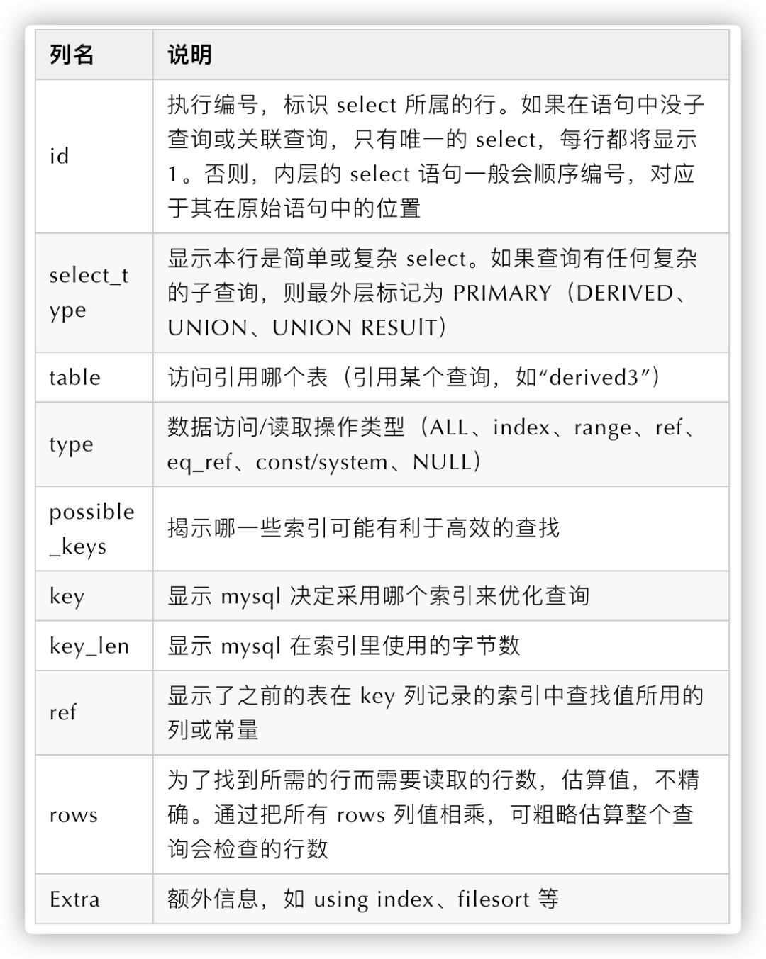 expain 出来的信息有 10 列,分别是 id、select_type、table、type、possible_keys、key、key_len、ref、rows、Extra,下面对这些字段出现的可能进行解释: