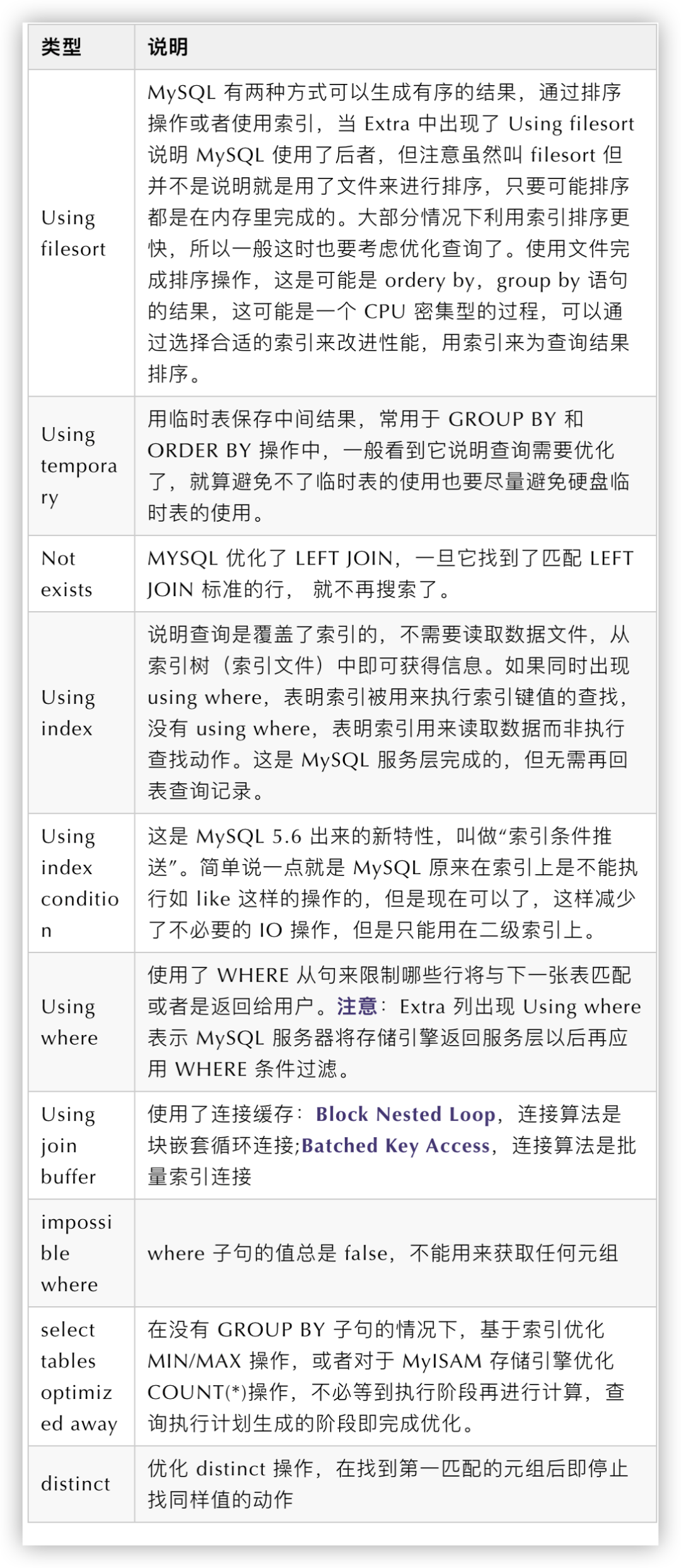 Extra 是 EXPLAIN 输出中另外一个很重要的列,该列显示 MySQL 在查询过程中的一些详细信息,MySQL 查询优化器执行查询的过程中对查询计划的重要补充信息。