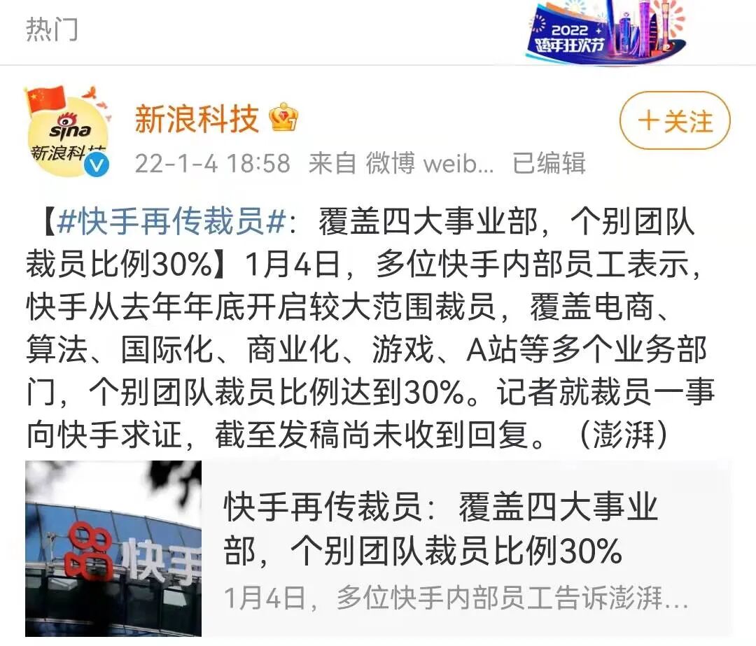 0、快手再传裁员:覆盖四大事业部,个别团队裁员比例 30%