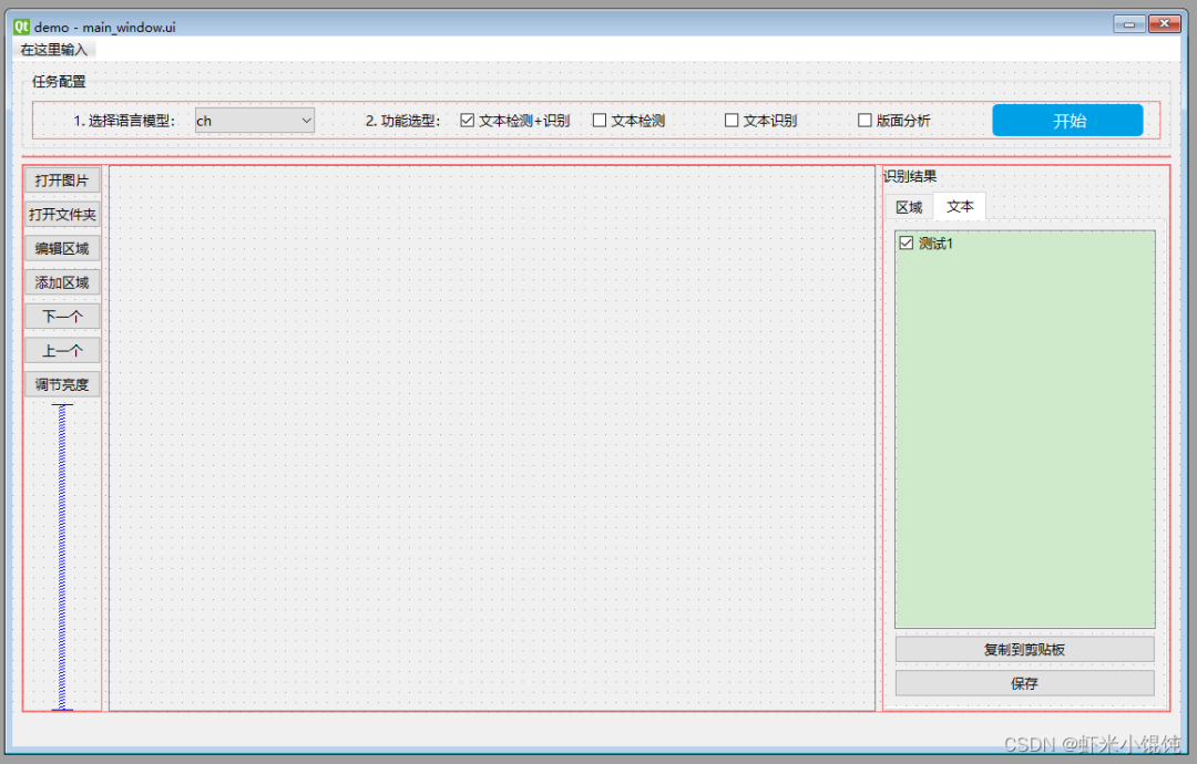 运行 python main.py 即可启动GUI程序。打开图片→选择语言模型ch(中文)→选择文本检测+识别→点击开始,检测完的文本区域会自动画框,并在右侧识别结果——文本Tab页的列表中显示。所有检测出文本的区域列表,在识别结果——区域Tab页:由于时间有限,软件细节功能还需进一步完善。代码已开源到 gitee 上,欢迎感兴趣的朋友提pull request,共同修改完善。https://gitee.com/signal926/ocr-gui-demo