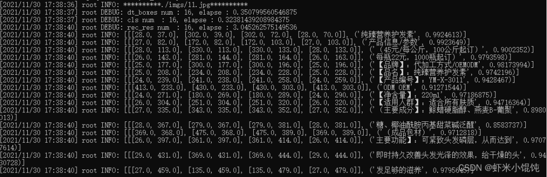 输出结果是一个list,每个item包含了文本框,文字和识别置信度:[[[24.0, 36.0], [304.0, 34.0], [304.0, 72.0], [24.0, 74.0]], ['纯臻营养护发素', 0.964739]] [[[24.0, 80.0], [172.0, 80.0], [172.0, 104.0], [24.0, 104.0]], ['产品信息/参数', 0.98069626]] [[[24.0, 109.0], [333.0, 109.0], [333.0, 136.0], [24.0