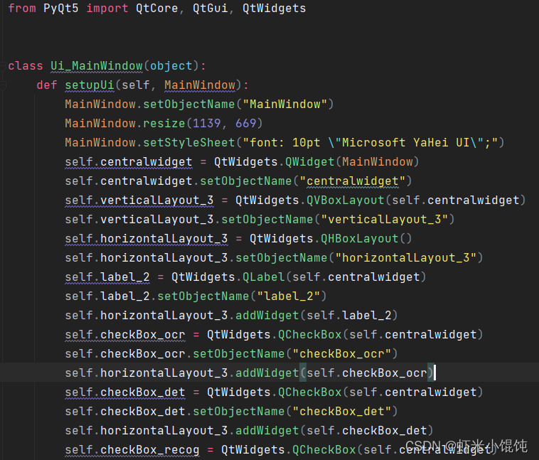 界面部分基于pyqt5实现,其中pyqt GUI程序开发入门和环境配置,详见一篇博客(具体见文末)。在QtDesigner中拖拽控件,完成程序界面布局,并保存*.ui文件。在 pycharm 的项目文件结构中找到*.ui文件,右键——External Tools——pyuic,会在ui文件同级目录下自动生成界面 ui 的 Python 代码。业务类 MainWindow 实现程序逻辑和算法功能,与前面第2步生成的ui实现解耦,避免每次修改ui文件会影响业务代码。ui界面上的控件可以通过self._ui.xxxObjectName 访问。class MainWindow(QMainWindow):