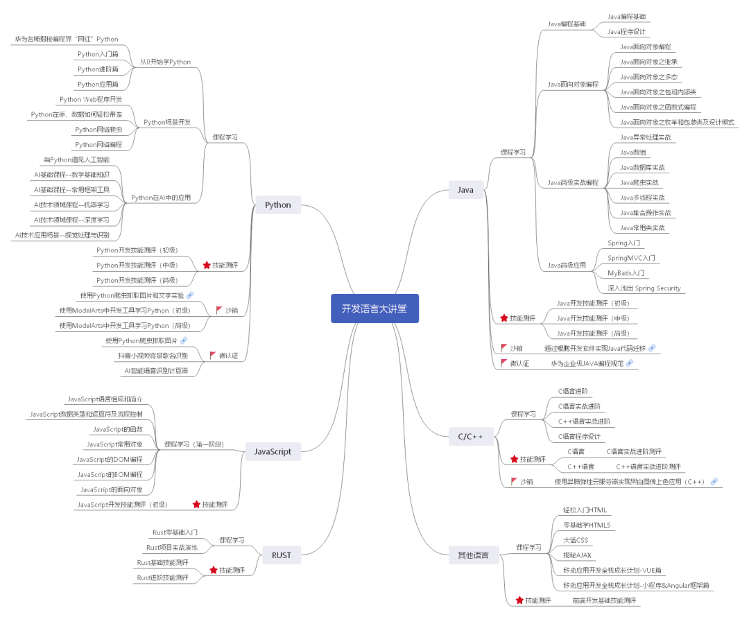 华为云培训中心官方推出 Python,Java,C,C++,Rust,JavaScript等免费精品课程。